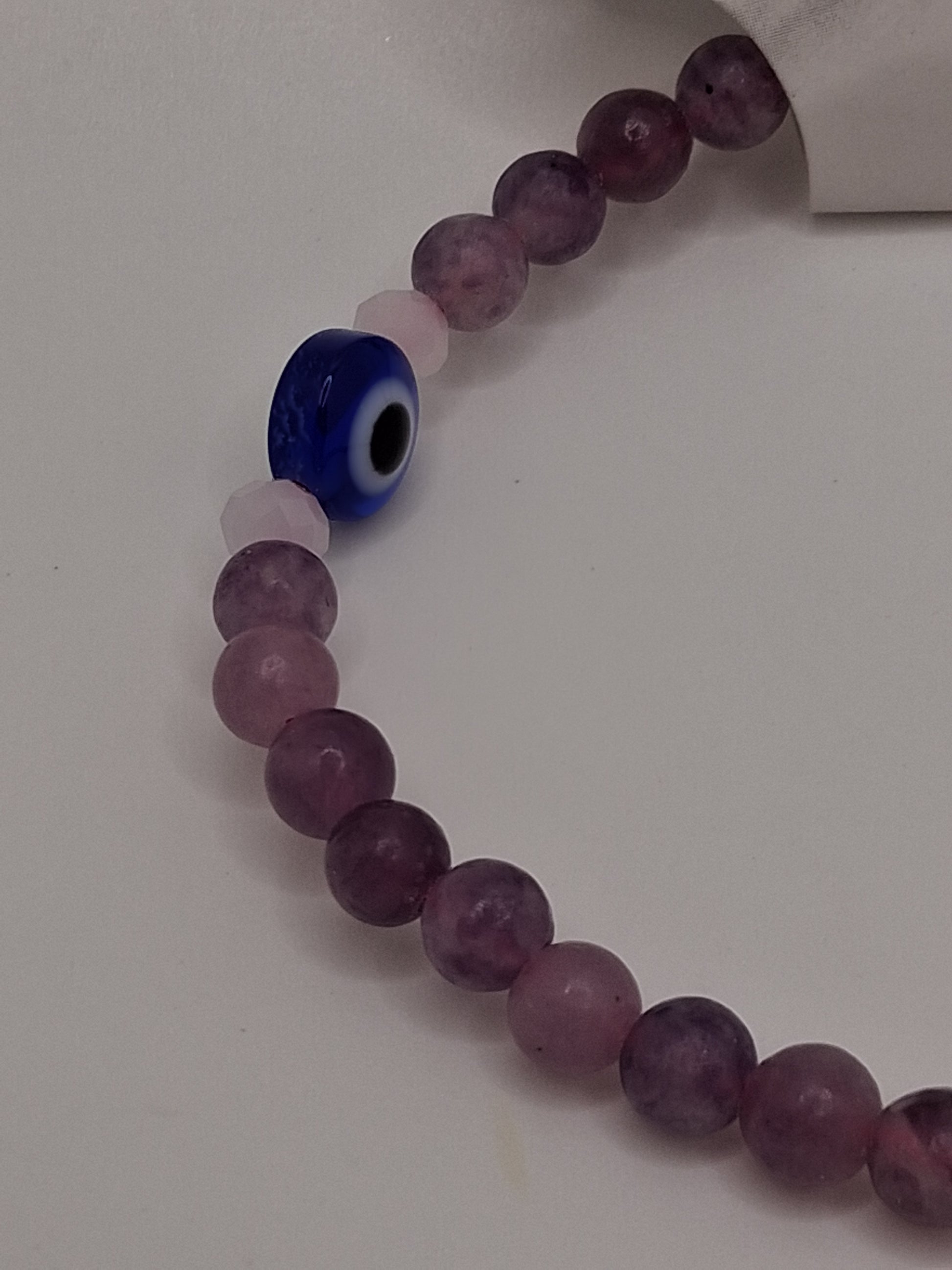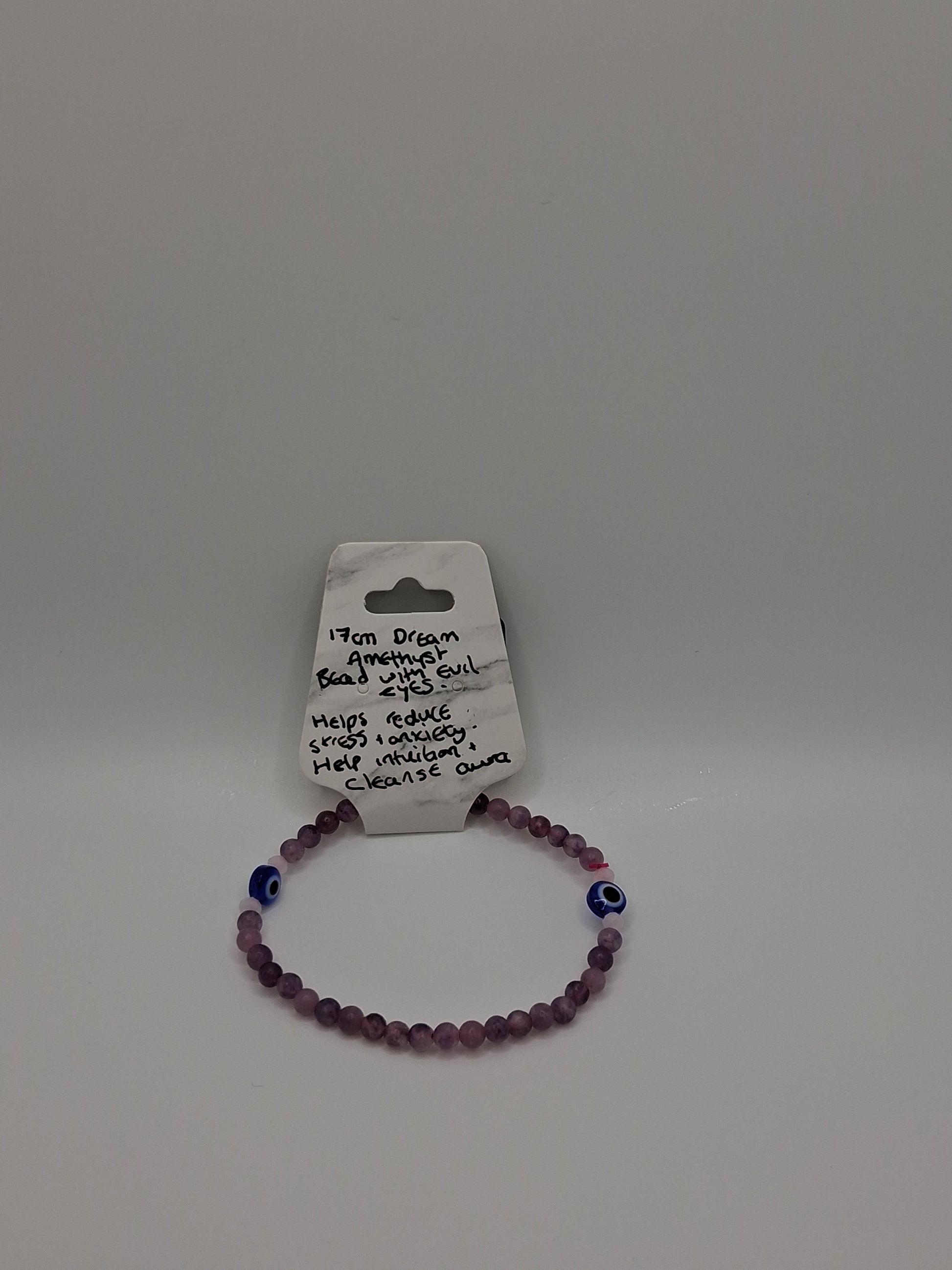 I make my own bracelets. This is a 17cm Dream Amethyst crystal bracelet with 2 blue evil eye beads either side.