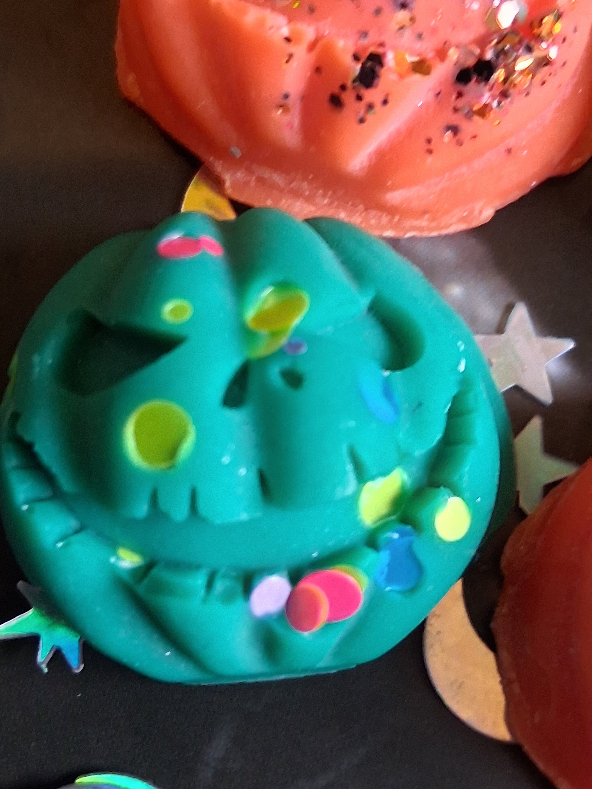 This listing is for a tub of 10 orange and 10 green pumpkins. 5 orange and 5 green have faces on. They have shimmering colour dye so they look beautiful as they are melting and they also have some biodegradable glitter on them too. They are a perfect combo for Halloween making the house smell incredibly spooooooky.