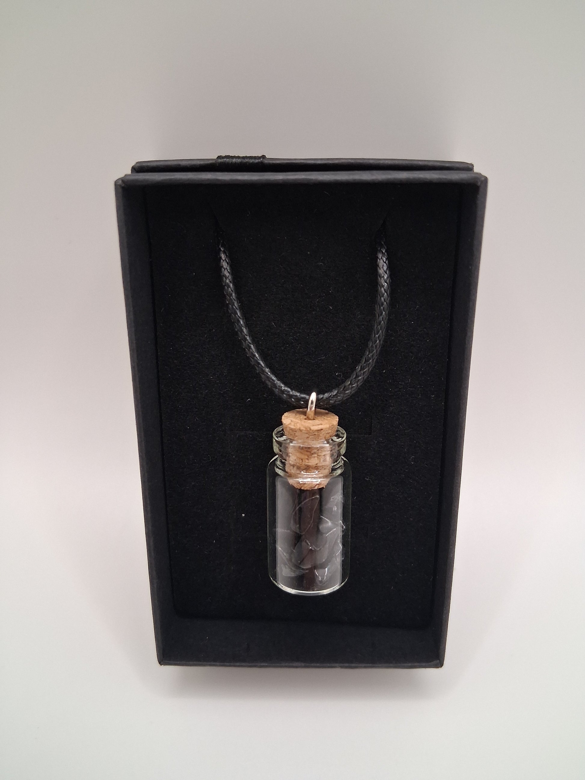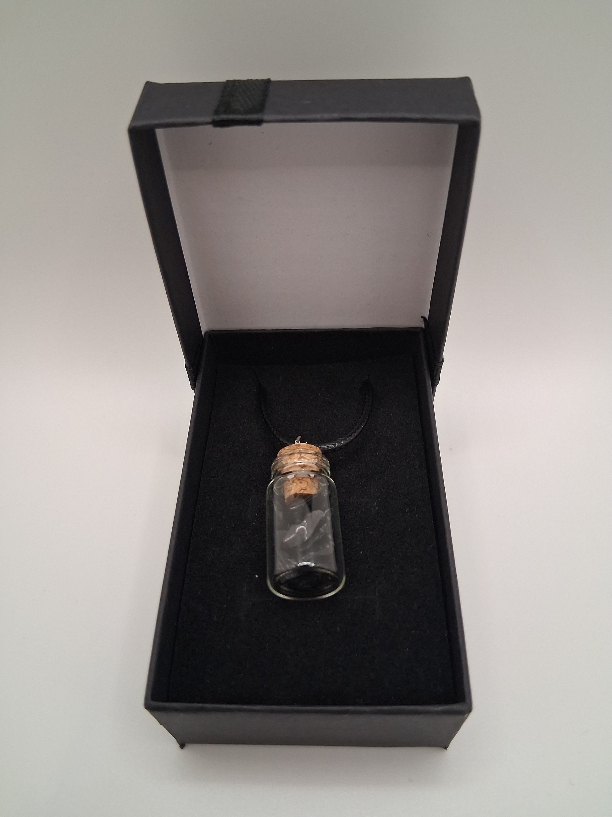 This is a beautiful crystal necklace. It had between 5/10 obsidian chips inside the bottle. It is on a black cord necklace and comes in a lovely jewellery box too.
