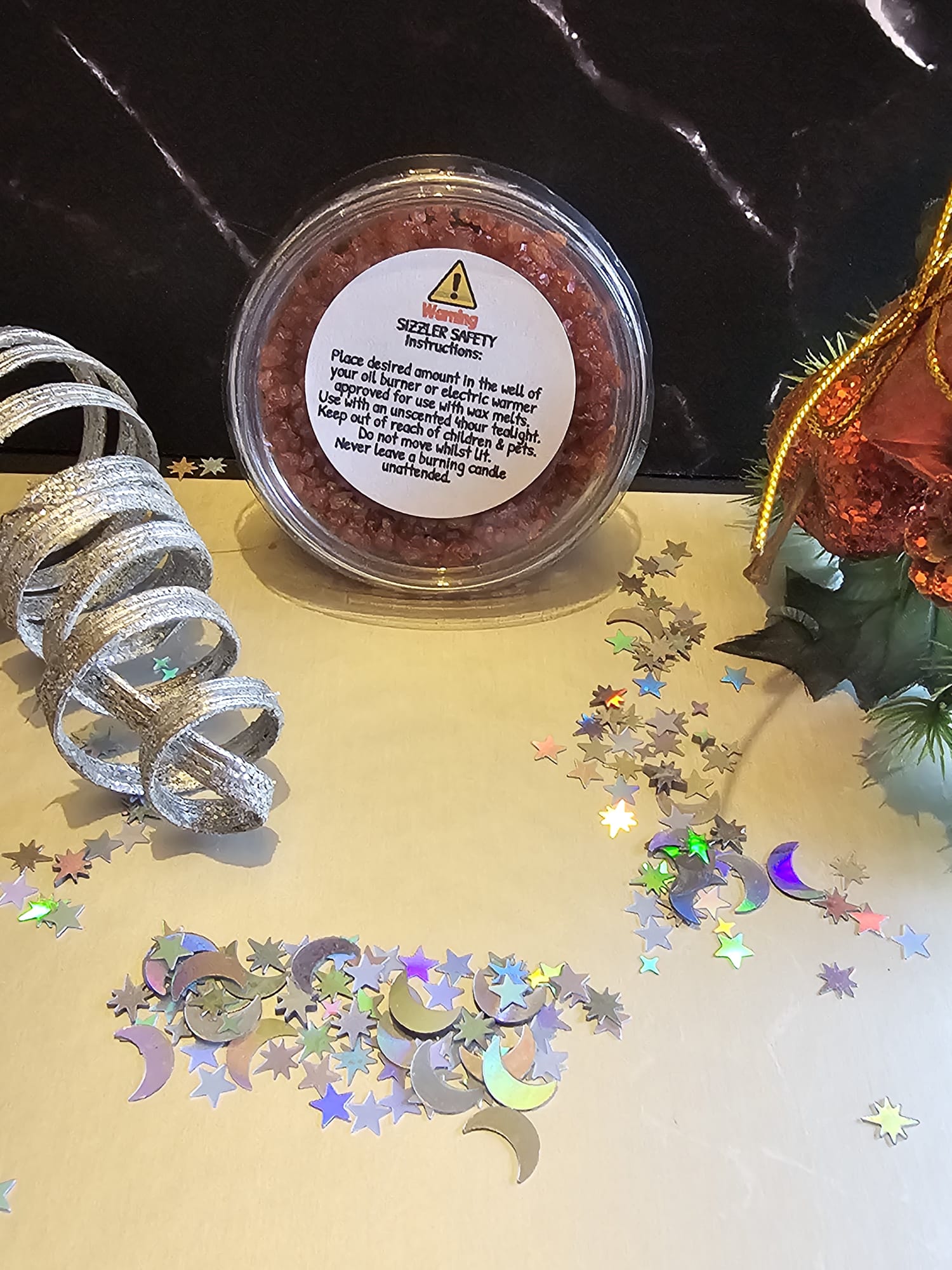 This is a pot of simmering granules in a lovely Christmas scent. These are an alternative to wax melts. Where as it can be tricky to get wax melts off your melter. With these granules you simply pour or spoon some granules on your melter, then when the fragrance has finished you simply tip the granules away and add some more. I added some mica to add a bit of sparkle for Christmas! Once you have these salts on your melter, your home will soon be filled with the Christmassy fragrance of Spicy Mulled Wine!