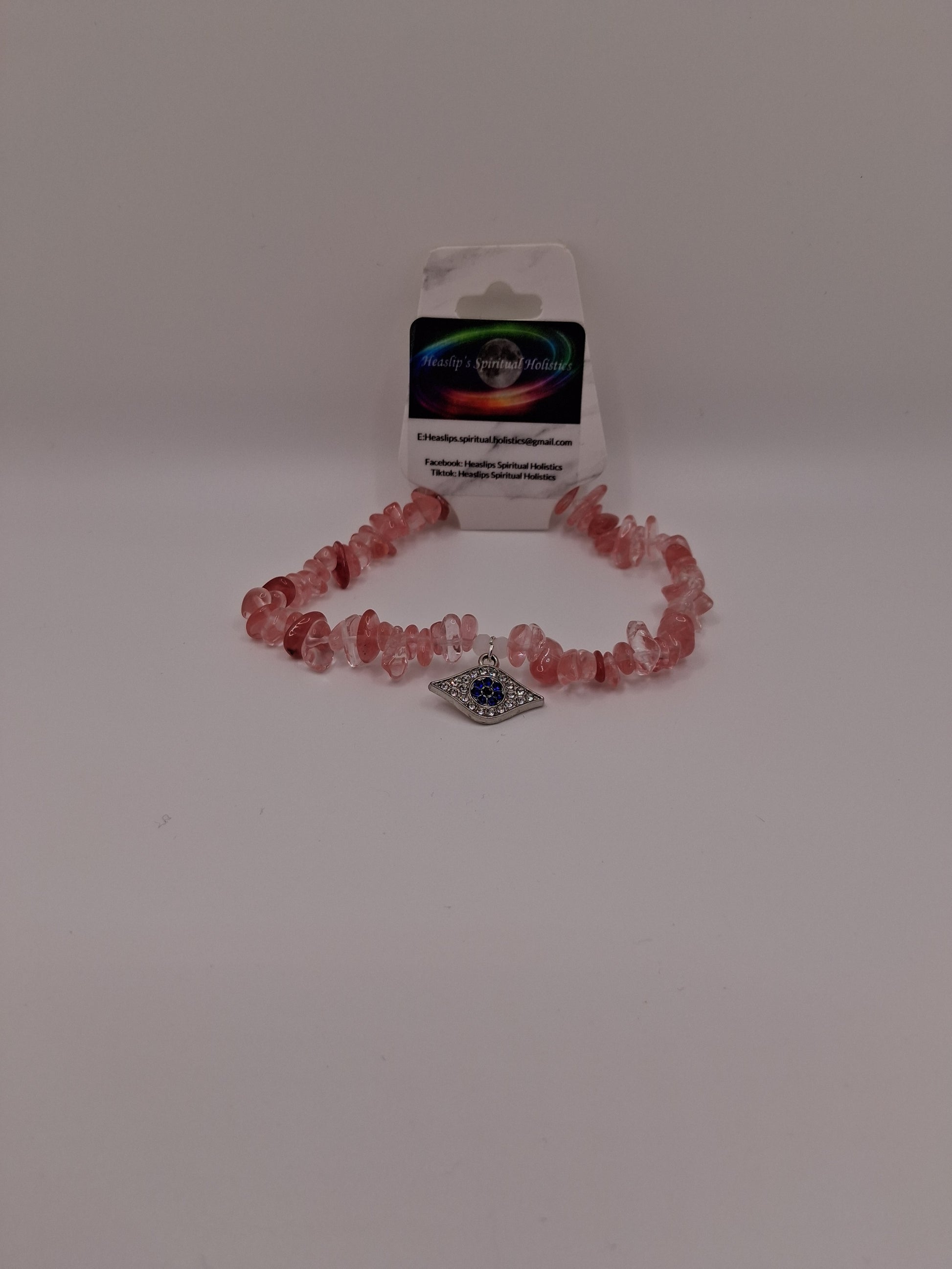 This is an 20cm bracelet. It has authentic Strawberry Quartz and a silver evil eye charm on it too. I handmade these myself. I can make bracelets to fit most wrist measurements with a variety of different crystals of your choice.