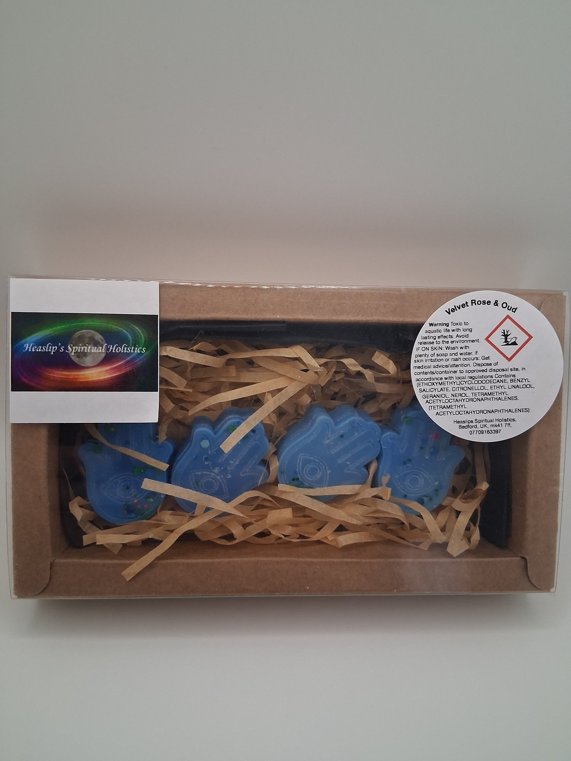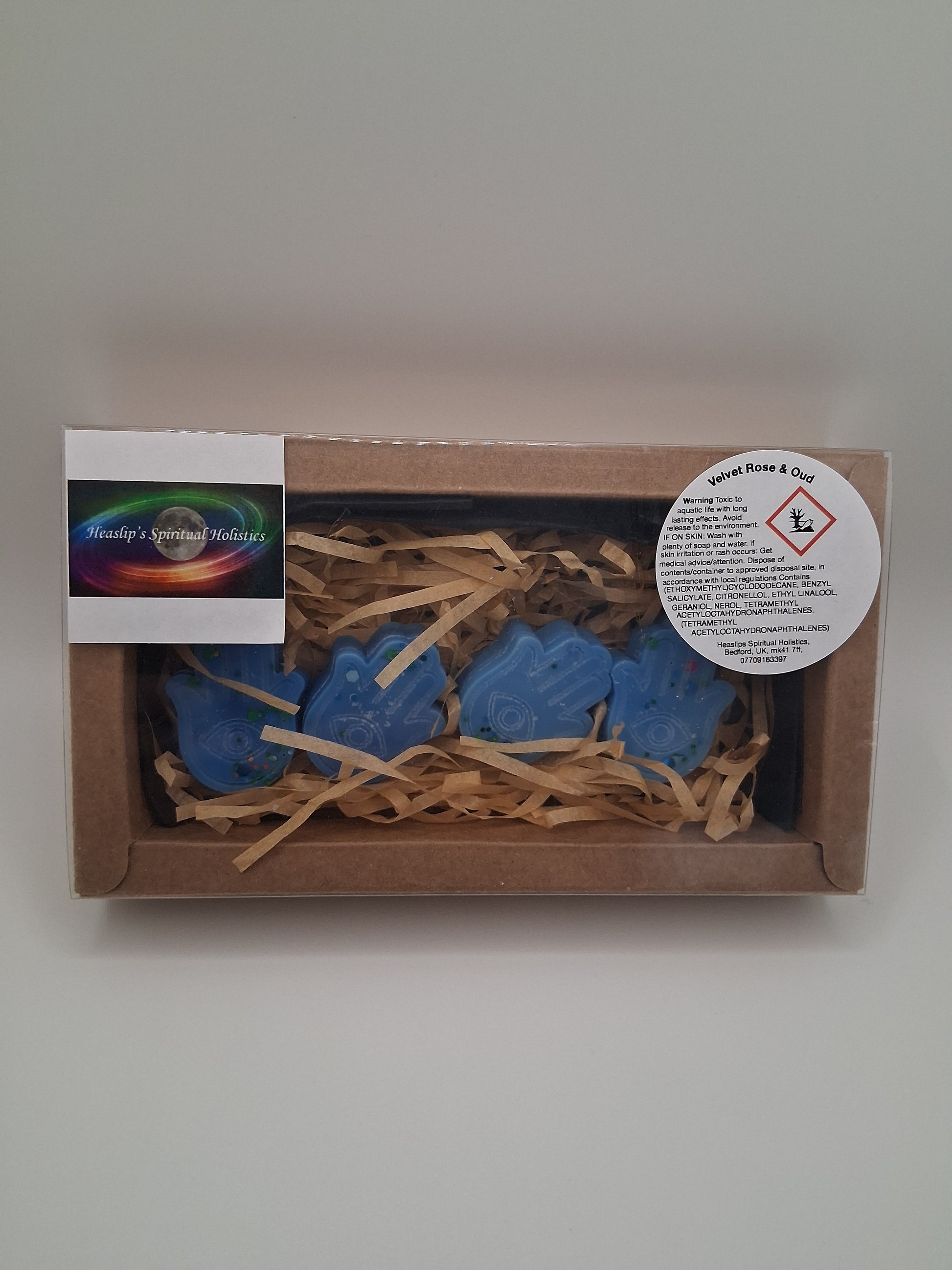 These are beautifully packaged 4 x small Hamsa Hands fragranced in Velvet Rose & Oud. They are blue dye coloured shapes made from KeraSoy wax with some biodegradable glitter in them.